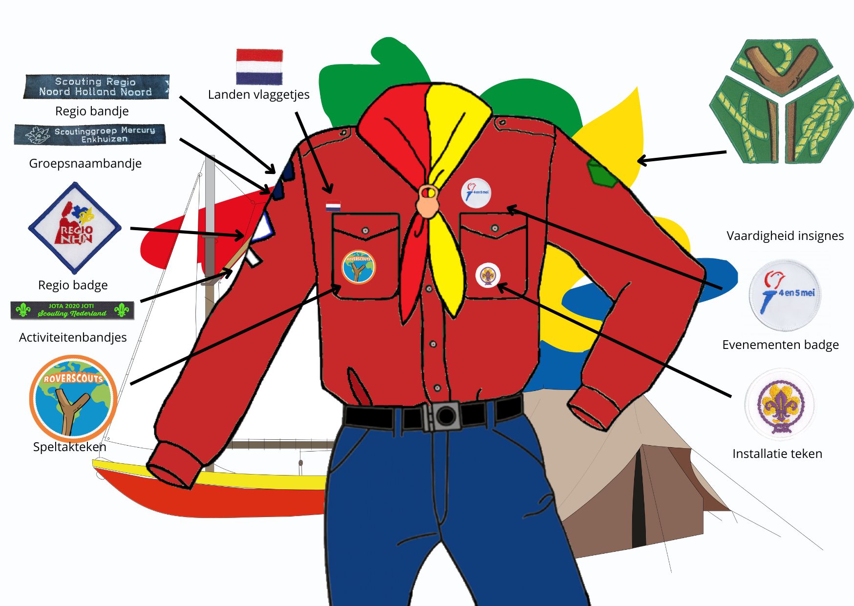 - 1. Regio bandje: Voor de Mercury groep is dit Scouting Regio Noord Holland Noord. Dit geeft namelijk aan in welke regio jou scouting groep zit.