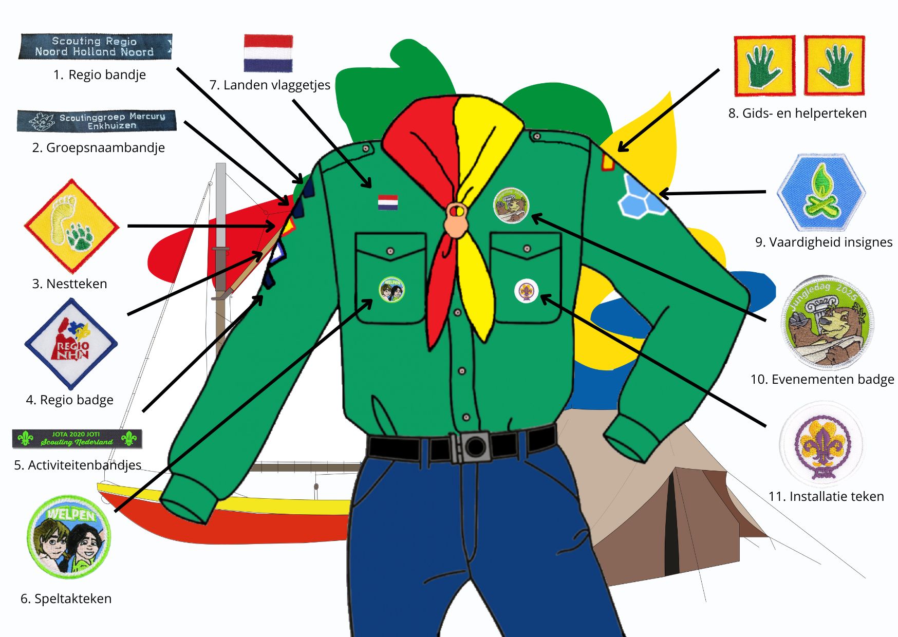 - 1. Regio bandje: Voor de Mercury groep is dit Scouting Regio Noord Holland Noord. Dit geeft namelijk aan in welke regio jou scouting groep zit.