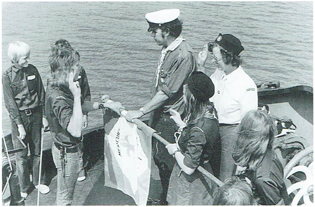 Installatie van Johan Desaunois door Schipper Frans Sijmons met de nieuwe groepsvlag. Verder zijn Frank Dijkman, An Sijmons en Rietje van Ammers zichtbaar.