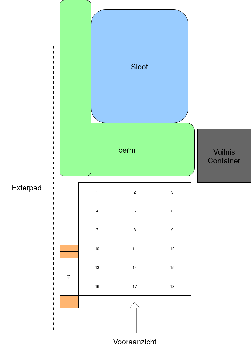 Begin "links-achter" (Stel je voor, je kijkt van straat naar voorkant podium)